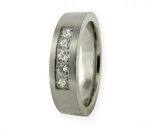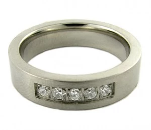 Krásný ocelový prsten s 5 bílými kameny (2 mm). Šíře prstenu je 4,9 mm. Prsten má jemně matovaný povrch. Sbalit popis