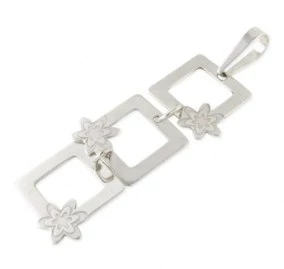 Nevšední přívěsek z bílého zlata má podobu obrysů třech čtverců, které jsou očky volně spojeny pod sebou. Každý ze čtverců je v jednom z rohů ozdoben kvítkem. Délka přívěsku bez provlékacího očka je 31 mm, v nejširším místě měří 12 mm. Povrch šperku je lesklý a hladký, pouze části kvítků jsou lehounce matovány. Provlékací očko má rozměr 6 x 3,5 mm. Sbalit popis