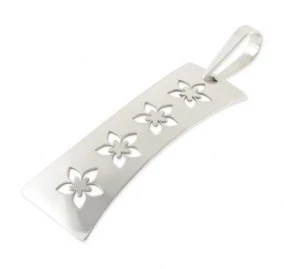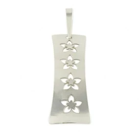 Krásný dámský přívěsek je vyroben z bílého zlata. Šperk má jednoduchý, ale velmi zajímavý tvar, který je lehce vypouklý. Délka přívěsku je 26 mm, šířka 10 mm. Povrch šperku je lesklý a hladký, zdobený pouze čtyřmi květinami, kterou jsou do přívěsku vyřezány. Provlékací očko má rozměry 7 x 3,5 mm. Sbalit popis